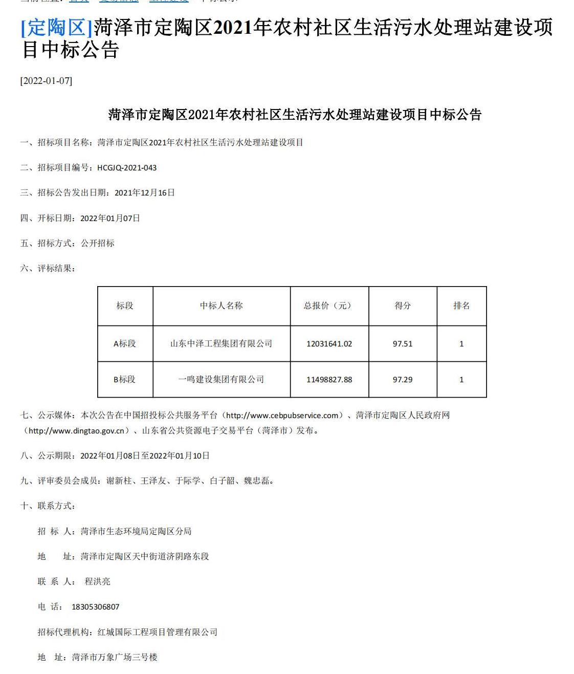 2022年1月7日,菏泽市公共资源交易中心公示了菏泽市定陶区2021年农村社区生活污水处理站建设项目A标段中标结果,天行在线注册成功中标,中标金额12031641.02元。
