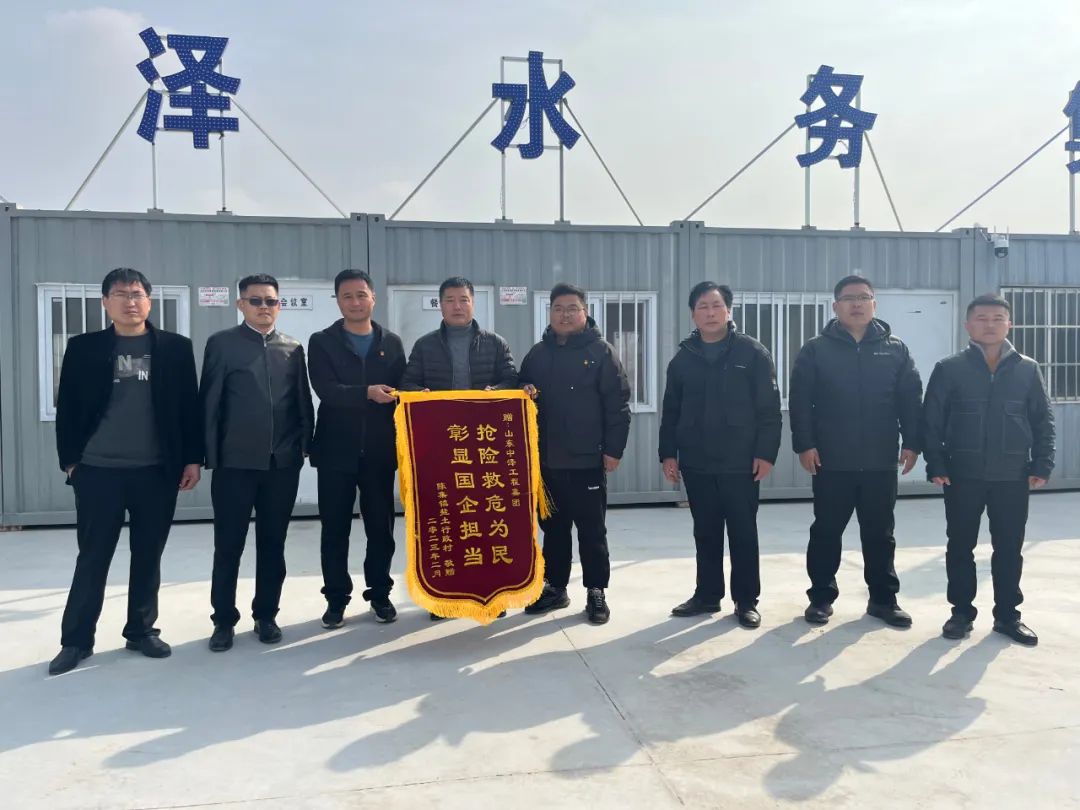 2月23日上午,陈集镇盐土村有关领导将一面写着“抢险救危为民,彰显国企担当”的锦旗送到山东中泽工程集团鲁西新区项目部,对靳荣剑、翟庆锋等人英勇救火的行为表示感谢。