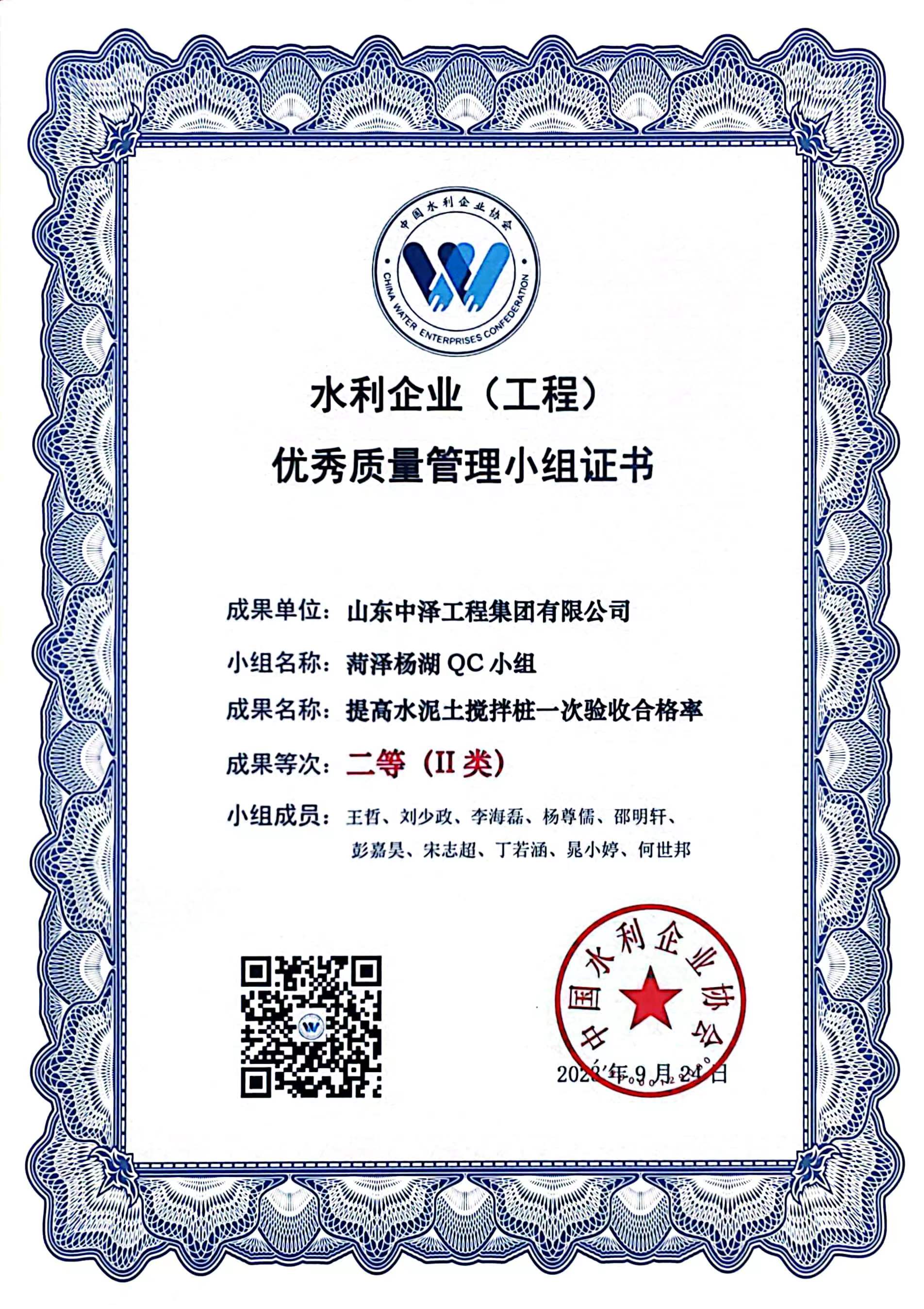 热烈祝贺山东中泽工程集团在2023年度水利企业优秀质量管理小组竞赛活动中再创佳绩