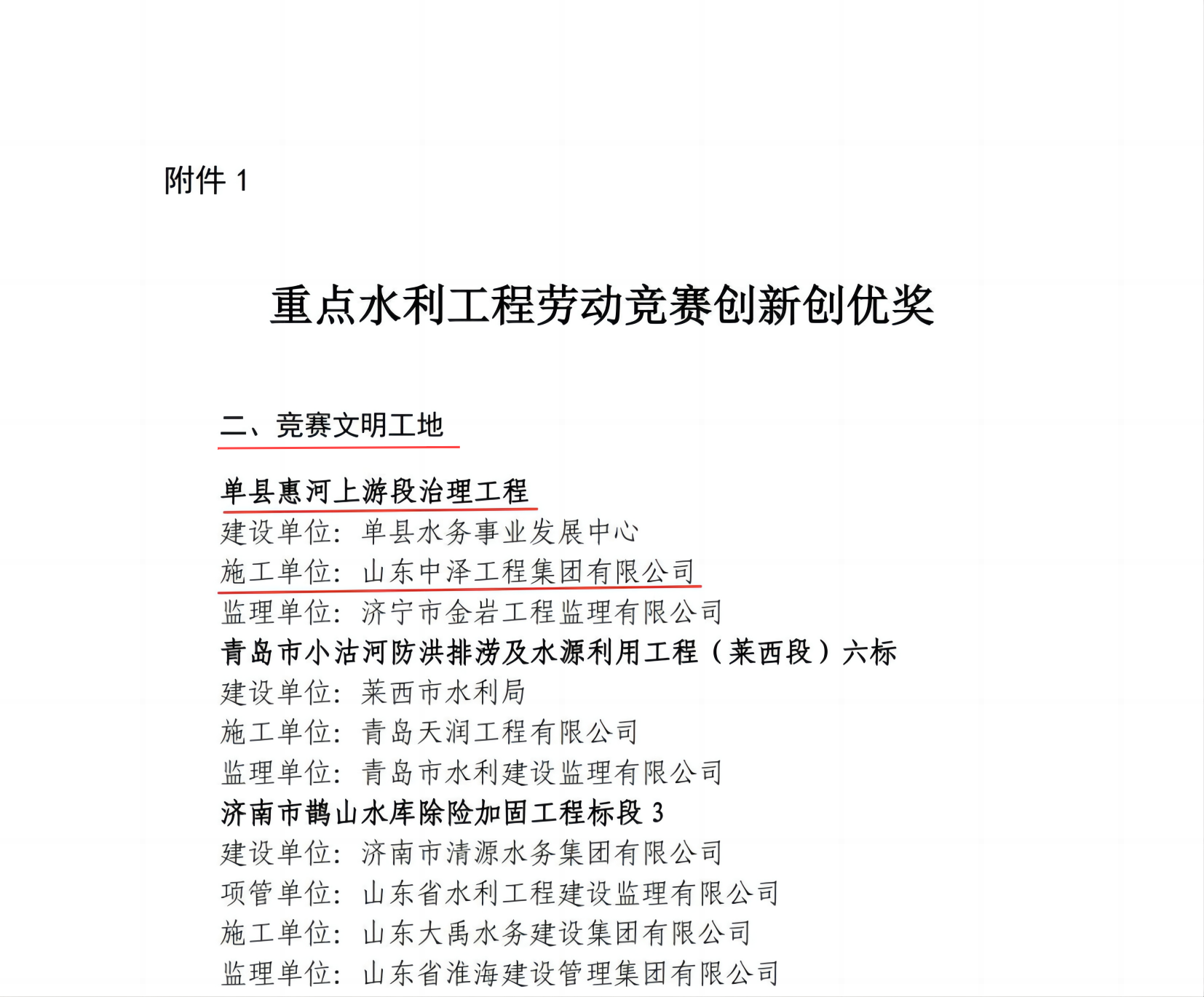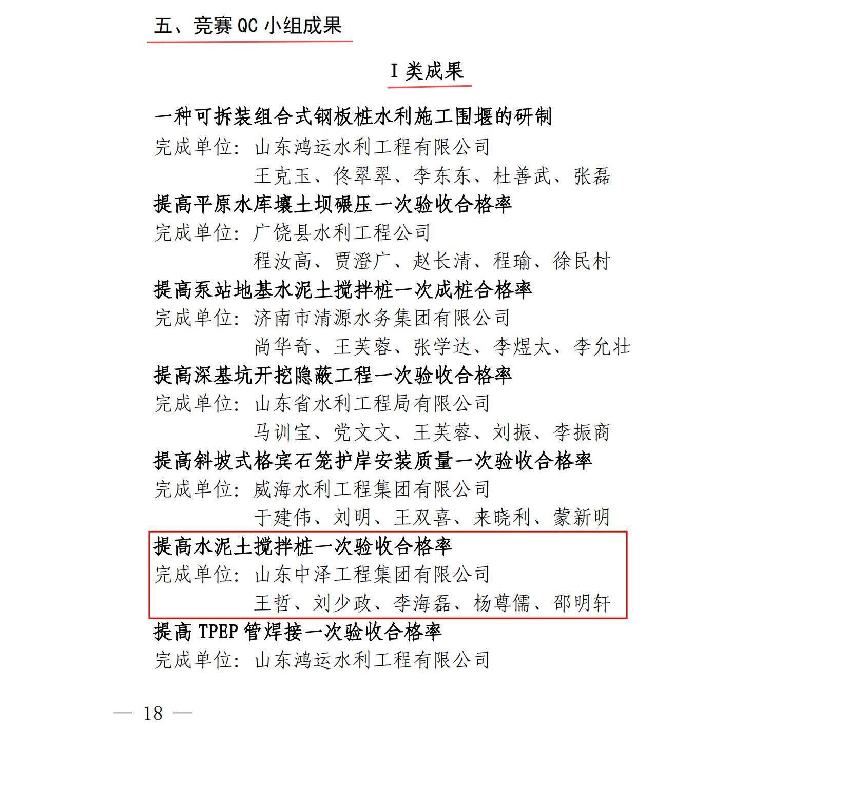 热烈祝贺山东中泽工程集团在全省重点水利工程建设“争进度、赛质量,比担当、创精品”创新创优劳动竞赛中取得佳绩